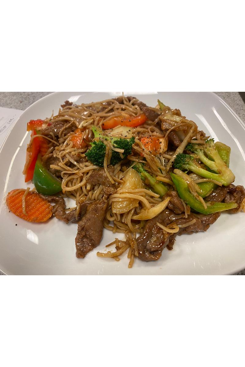 Biff/kylling/scampi/sjømat Nudler, grønnsaker og hjemmelaget saus.
