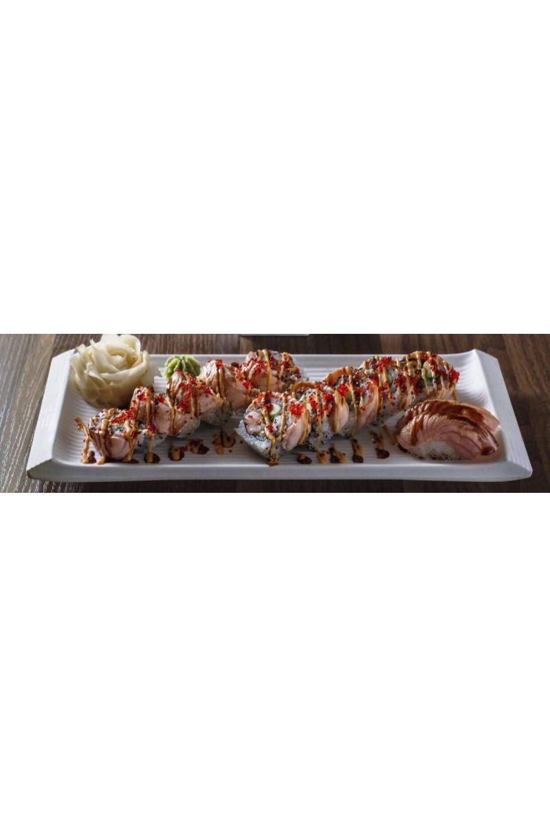 Frityrstekt Scampi og Laks, Agurk, avokado og flyvefiskrogn