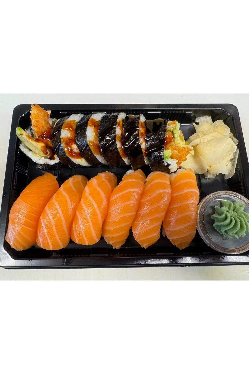 6 laks nigiri, 6 tempura laks maki med chillimajo og teriyakisaus.