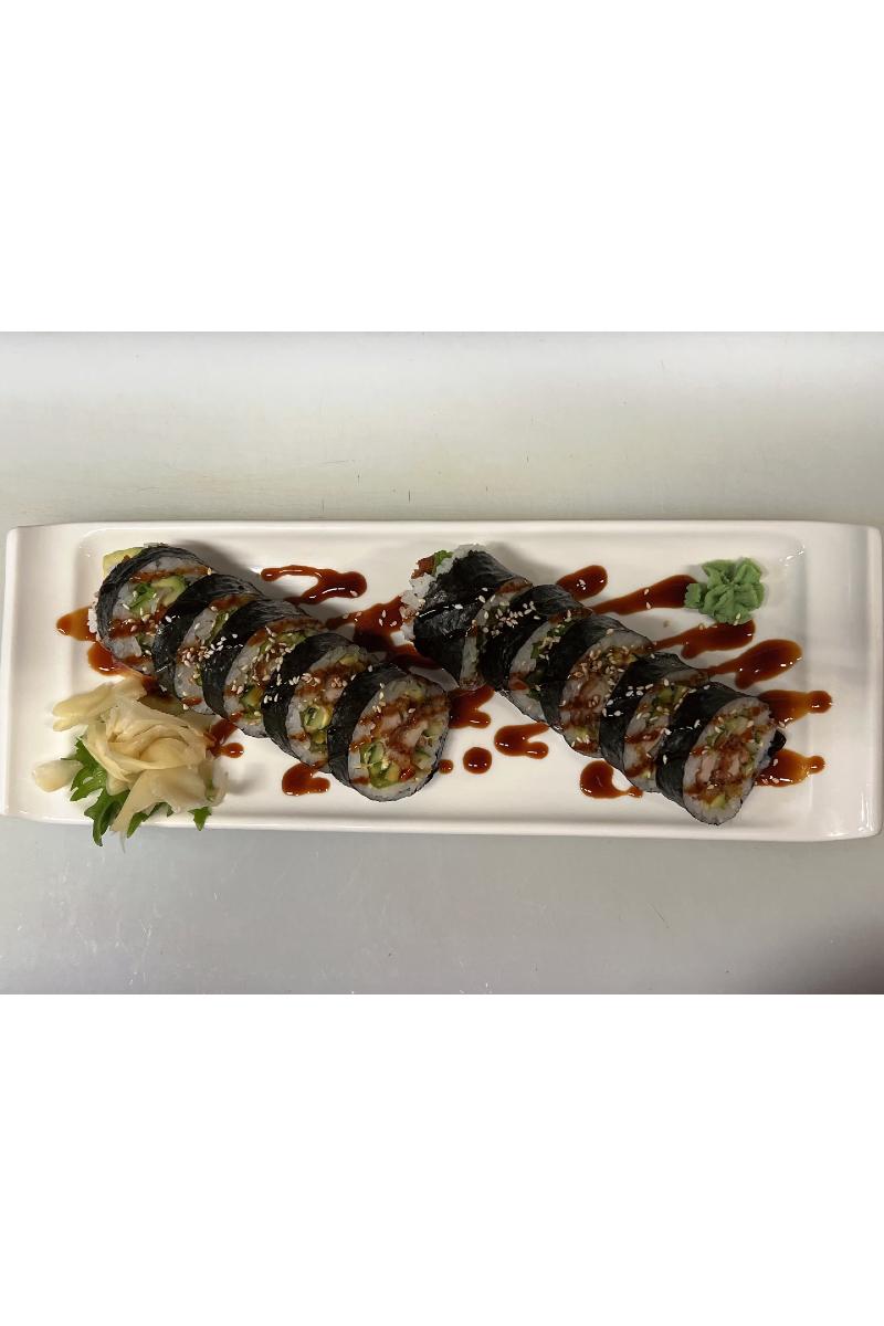 Fritert kylling, avocado, agurk, gulrot, chilli majones og Teriyakisaus.