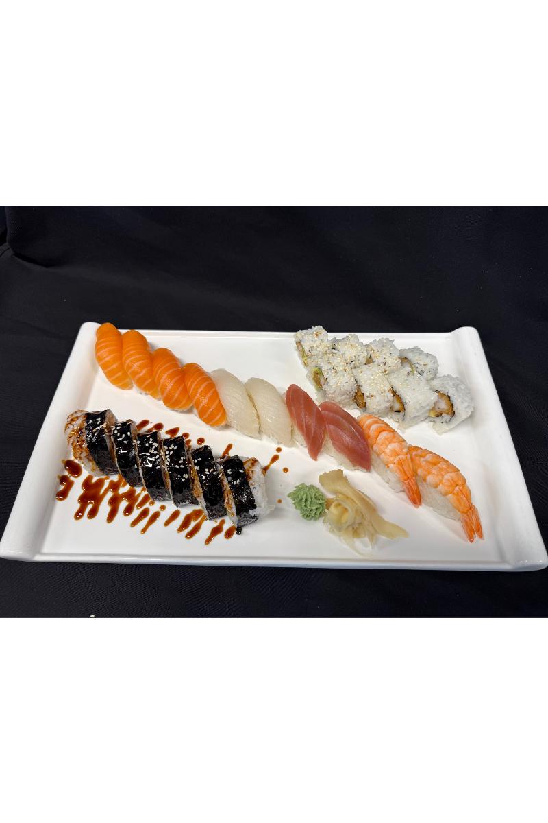 12 nigiri biter, 6b futo laks maki og 8b tempura scampi maki